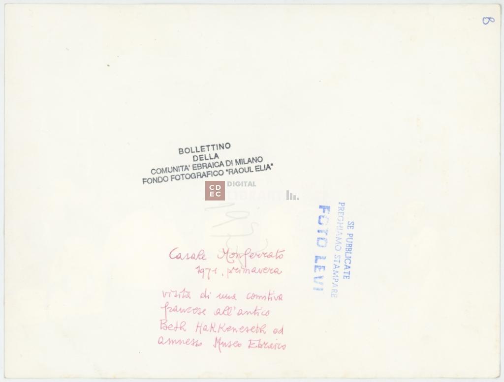 | iscrizioni | sul verso del supporto in basso l'iscrizione manoscritta a penna rossa "Casale Monferrato 1971, primavera/ visita di una comitiva francese all'antico Beth Hakkeneseth ed annesso Museo Ebraico" |