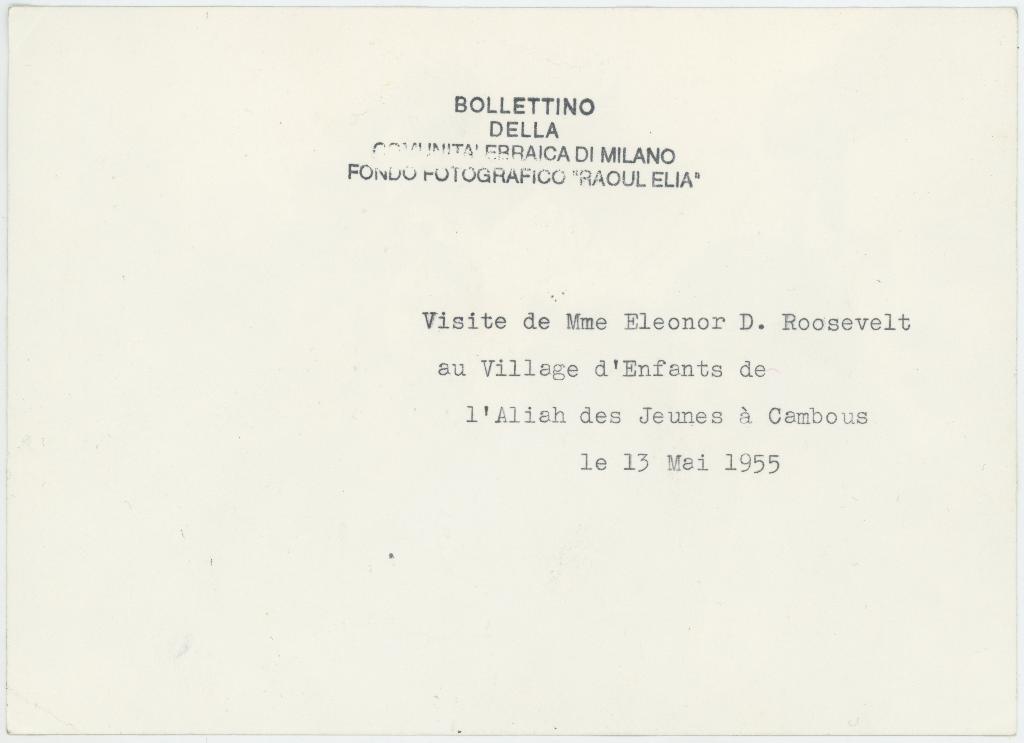 | iscrizioni | sul verso del supporto la didascalia dattiloscritta "Visite de Mme Eleonor D. Roosevelt au Village d'Enfants de l'Aliah des Jeunes à Cambous le 13 Mai 1955" |