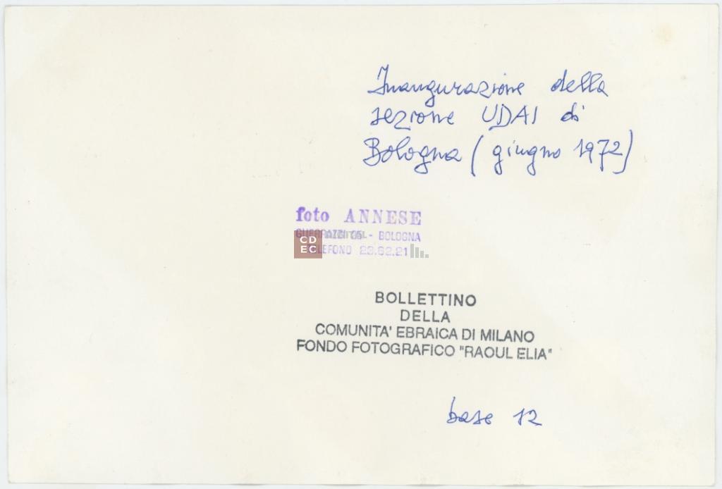 | notizie storico-critiche | All'inaugurazione della sezione dell'UDAI a Bologna parteciparono, così come riportato nella didascalia a corredo della fotografia pubblicata sul "Bollettino della Comunità Israelitica di Milano", il dottore Giangaspare Balderi, la dottoressa Liliana Formiggini, il professore Giorgio Bonfiglioli, l'avvocato Dagoberto Degli Esposti, il Presidente professore Giuseppe Tramarollo, l'avvocato Roberto Vighi, il ragioniere Gianfranco Galletti, l'avvocato Riccardo Artelli e il ragioniere Roberto Braconi. |
