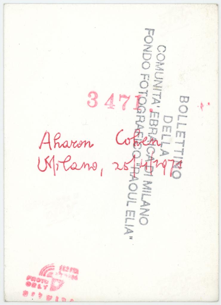 | timbri, marchi | sul verso del supporto il timbro a inchiostro "Bollettino della Comunità ebraica di Milano/ Fondo fotografico "Raoul Elia" e il timbro a inchiostro rosso con il marchio commerciale del fotografo illeggibile |