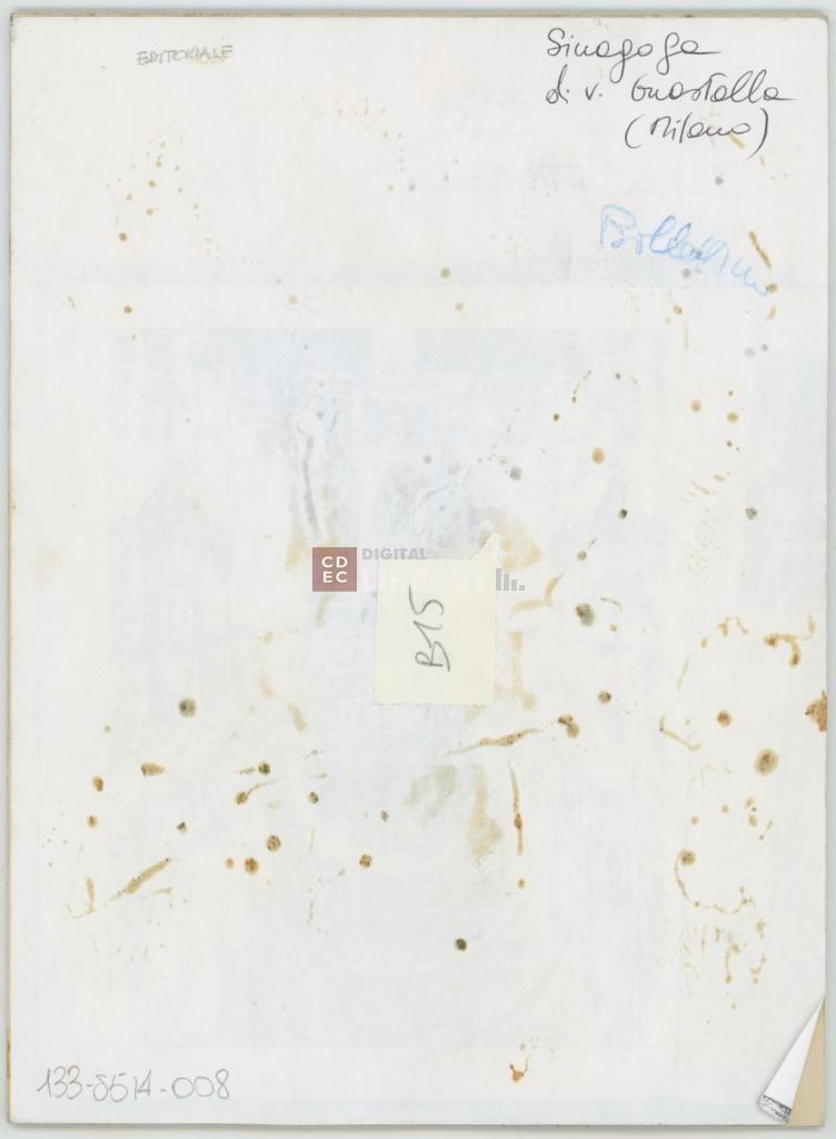 | iscrizioni | sul verso del supporto secondario in alto le iscrizioni manoscritte "Editoriale", "Sinagoga di v. Guastalla (Milano)" e "Bollettino" |