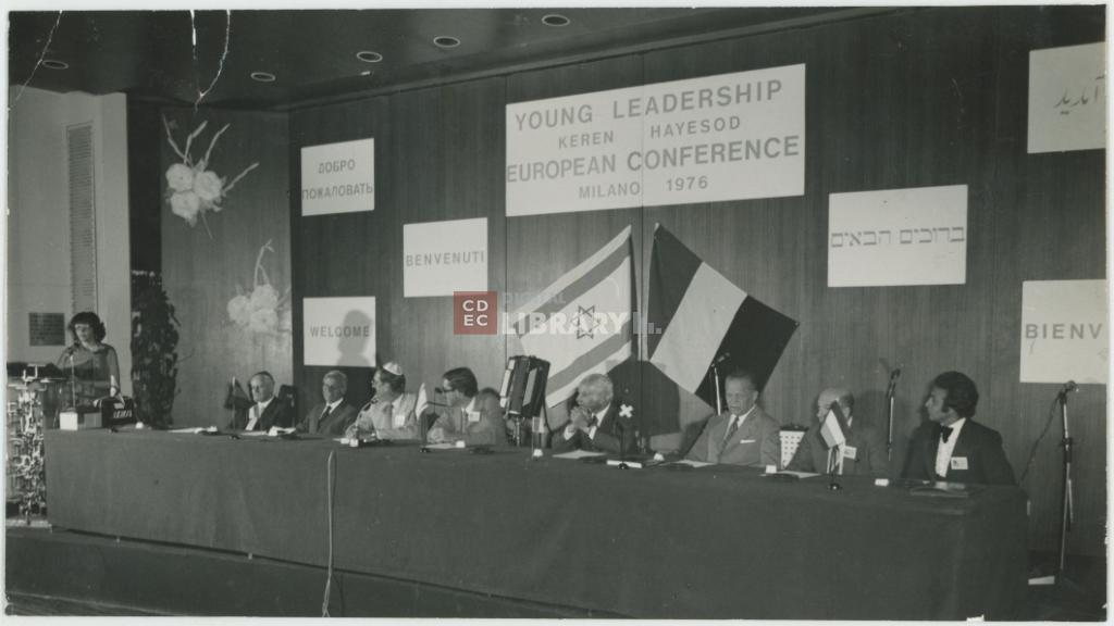titolo attribuito | Ritratto del Presidente Guido Jarach e degli oratori alla Conferenza europea annuale della Young Leadership del Keren Hayesod a Milano nel 1976 |