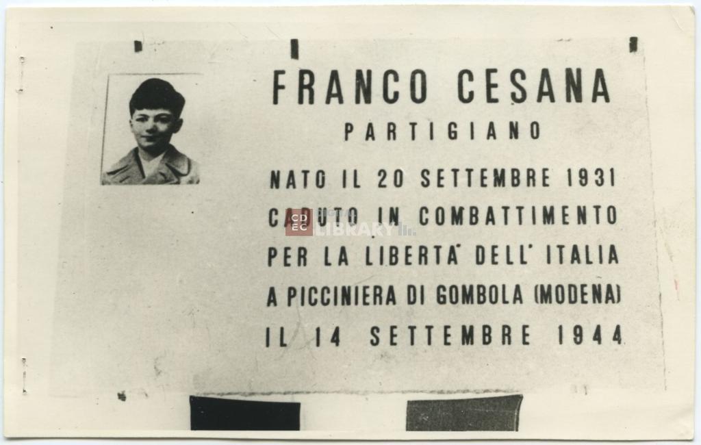 | osservazioni | La scuola primaria "Franco Cesana" è situata a Bologna in via Alessandro Guardassoni 1. Sulla lapide è presente in fotoceramica in alto a sinistra l'unico ritratto esistente del partigiano Franco Cesana; a destra la seguente dedica: "Franco Cesana partigiano nato il 20 settembre 1931 caduto in combattimento per la libertà dell'Italia a Picciniera di Gombola (Modena) il 14 settembre 1944". |