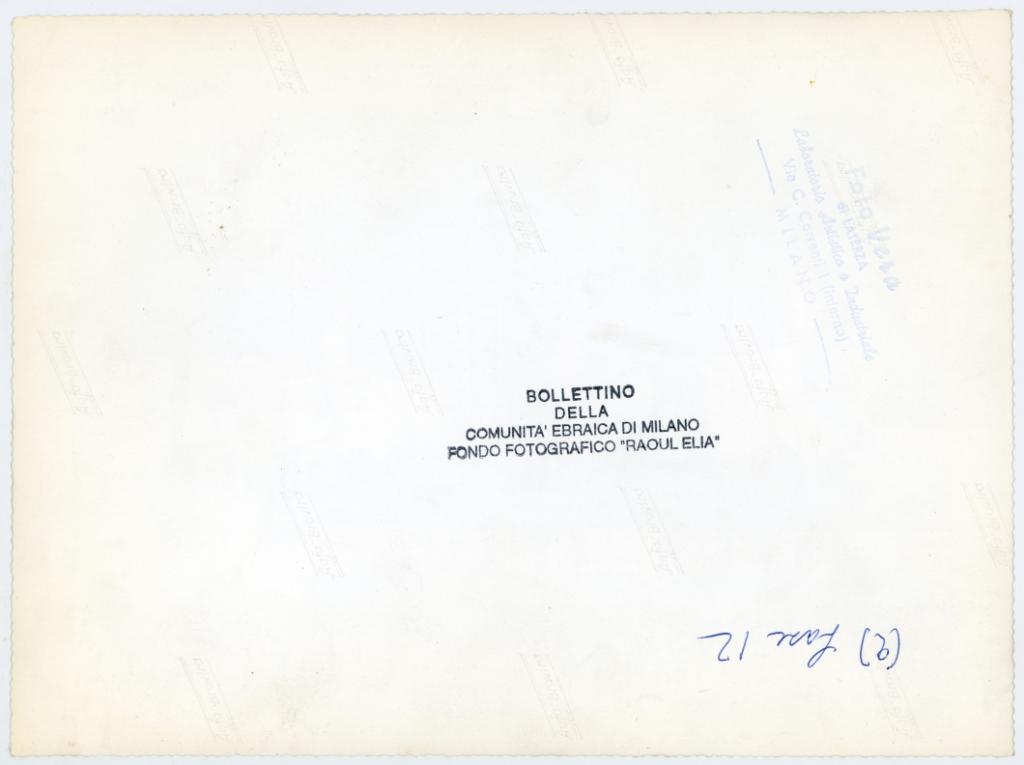 | timbri, marchi | sul verso del supporto il timbro a inchiostro "Bollettino della Comunità ebraica di Milano/ Fondo fotografico Raoul Elia" |