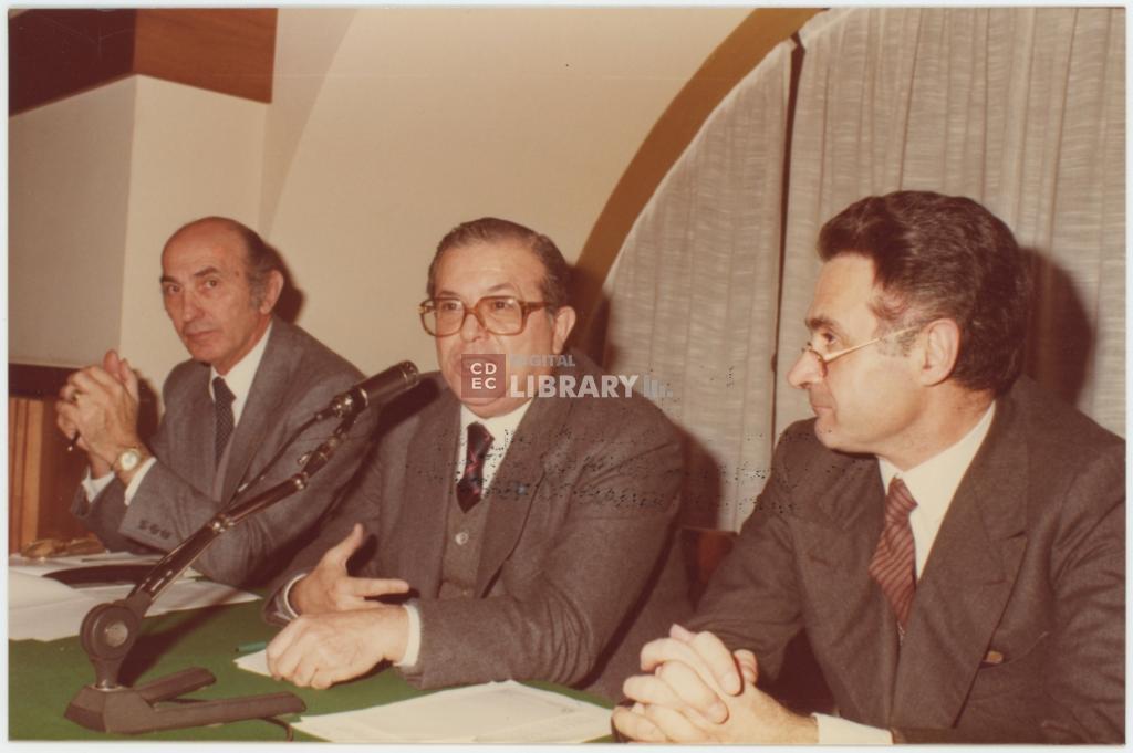 titolo attribuito | Ritratto di Davide Hodara seduto al tavolo degli oratori insieme ad altri due uomini |