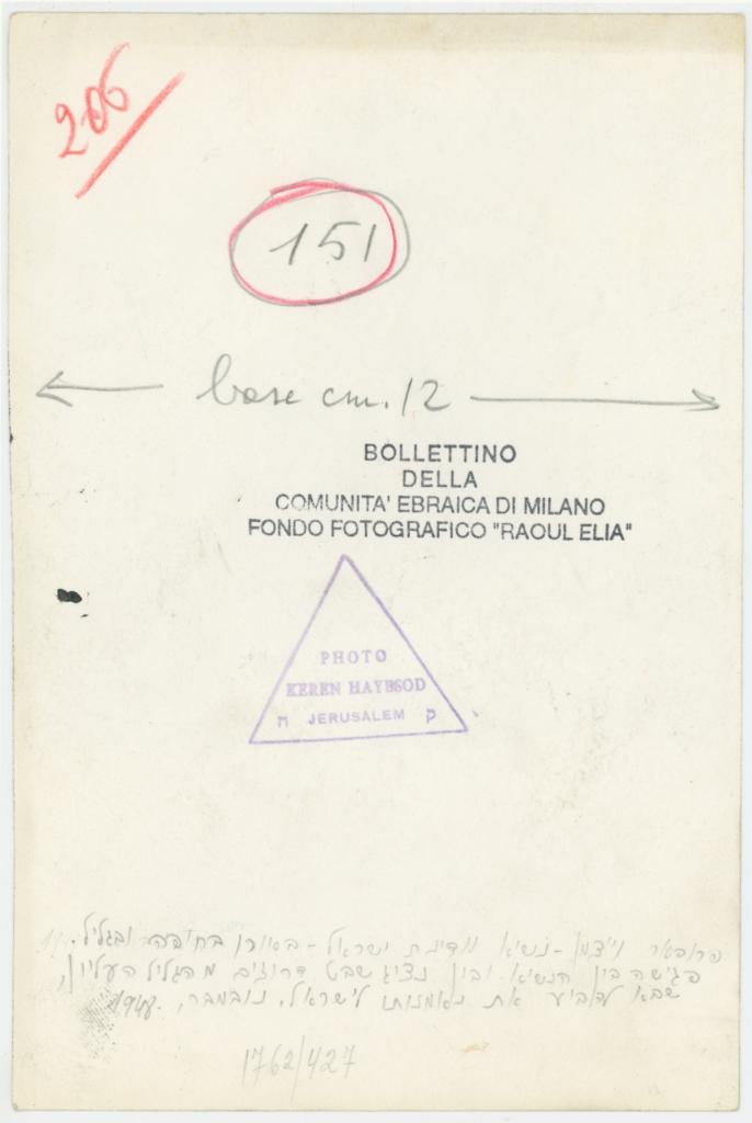 | timbri, marchi | sul verso del supporto il timbro a inchiostro "Bollettino della Comunità ebraica di Milano/ Fondo Fotografico Raoul Elia" |