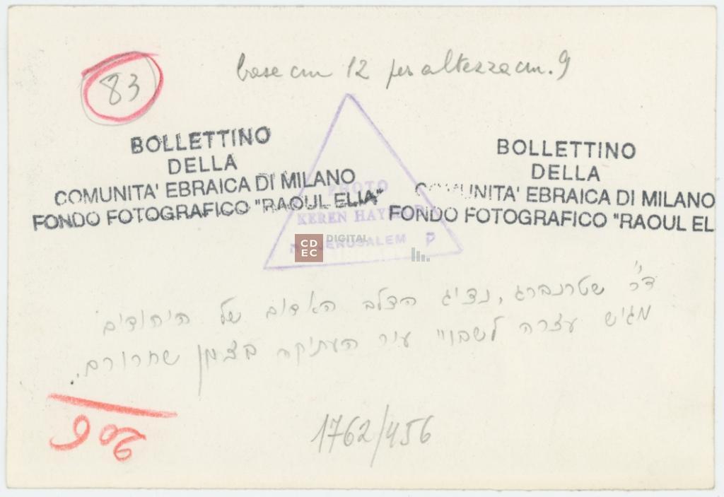 timbri, marchi | sul verso del supporto il timbro a inchiostro "Bollettino della Comunità ebraica di Milano/ Fondo Fotografico Raoul Elia" e il timbro commerciale del Keren Hayesod |
