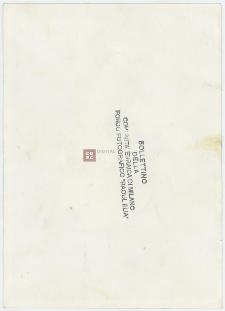 timbri, marchi | sul verso del supporto il timbro a inchiostro "Bollettino della Comunità ebraica di Milano/ Fondo Fotografico Raoul Elia" |
