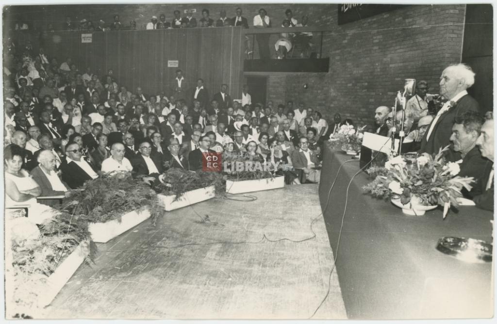 titolo attribuito | Ritratto del Primo Ministro David Ben Gurion che parla ai partecipanti alla cerimonia d'inaugurazione del Congresso Mondiale per la lingua ebraica a Gerusalemme |