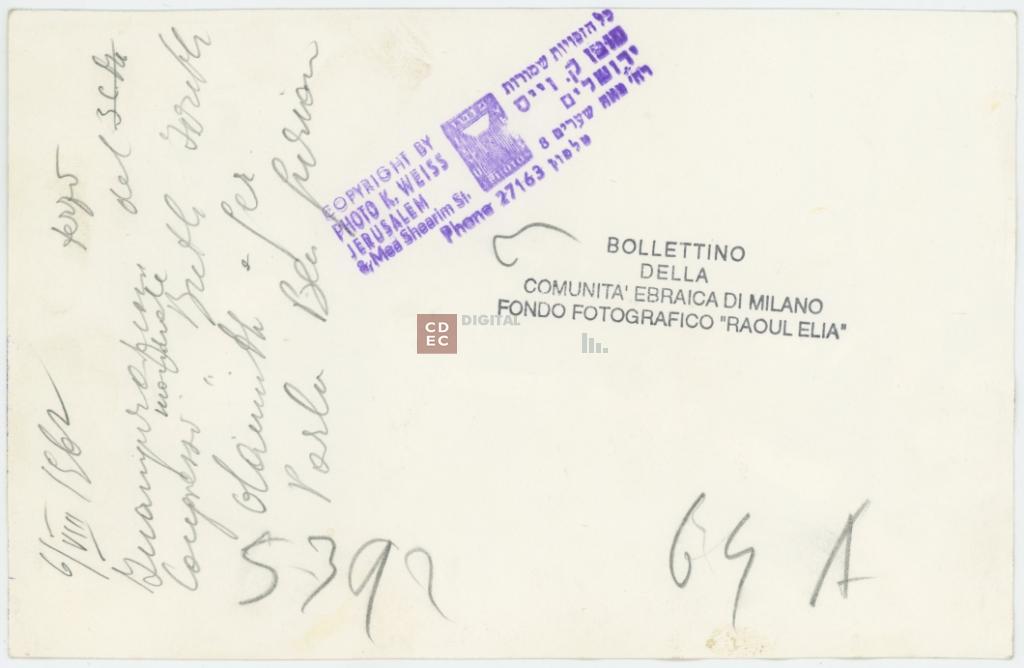 timbri, marchi | sul verso del supporto il timbro a inchiostro "Bollettino della Comunità ebraica di Milano/ Fondo Fotografico "Raoul Elia" |