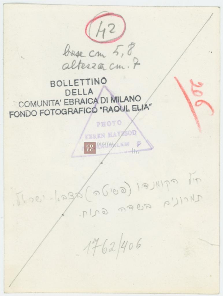 timbri, marchi | sul verso del supporto il timbro a inchiostro "Bollettino della Comunità ebraica di Milano/ Fondo Fotografico "Raoul Elia" e al centro timbro a inchiostro "Photo Keren Hayesod/ Jerusalem" |