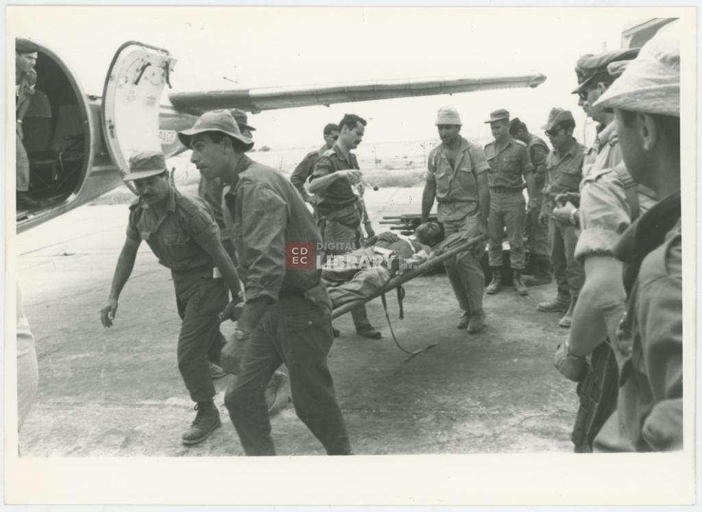 titolo attribuito | Ritratto di soldati israeliani che trasportano una barella con un uomo ferito su un aereo ambulanza |