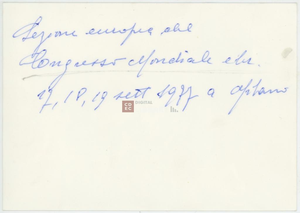 iscrizioni | sul verso del supporto iscrizione manoscritta a penna "Sezione europea al Congresso Mondiale ebr./ 17,18,19 sett 1977 a Milano" |