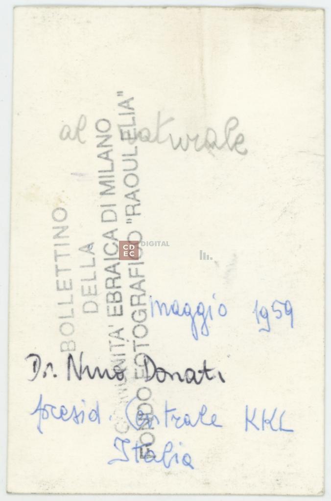 iscrizioni | sul verso del supporto l'iscrizione manoscritta a penna "maggio 1959/ Dr. Nino Donati/ presid. Centrale KKL/ Italia" |