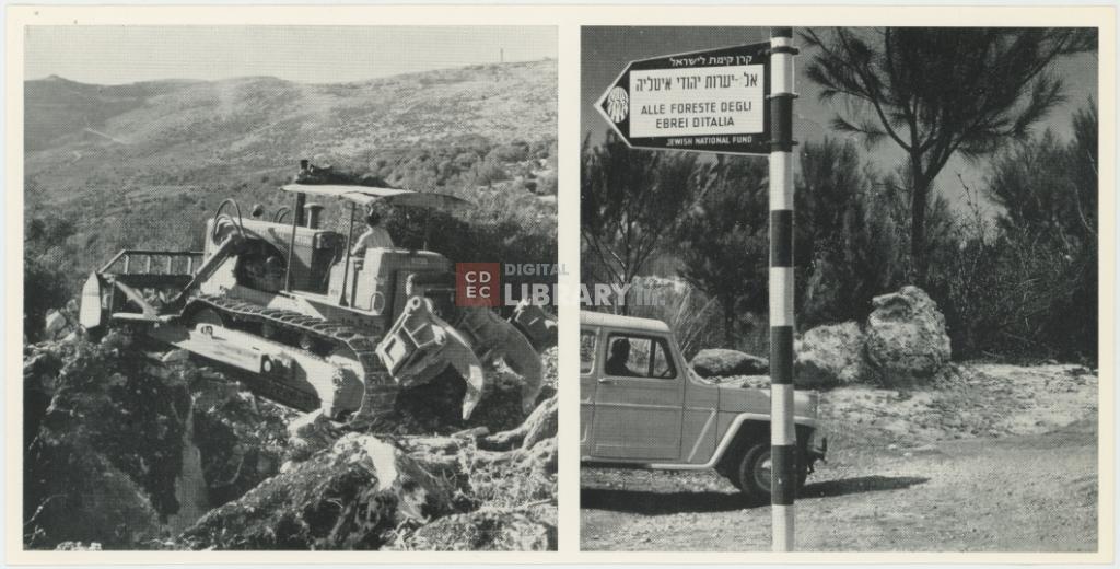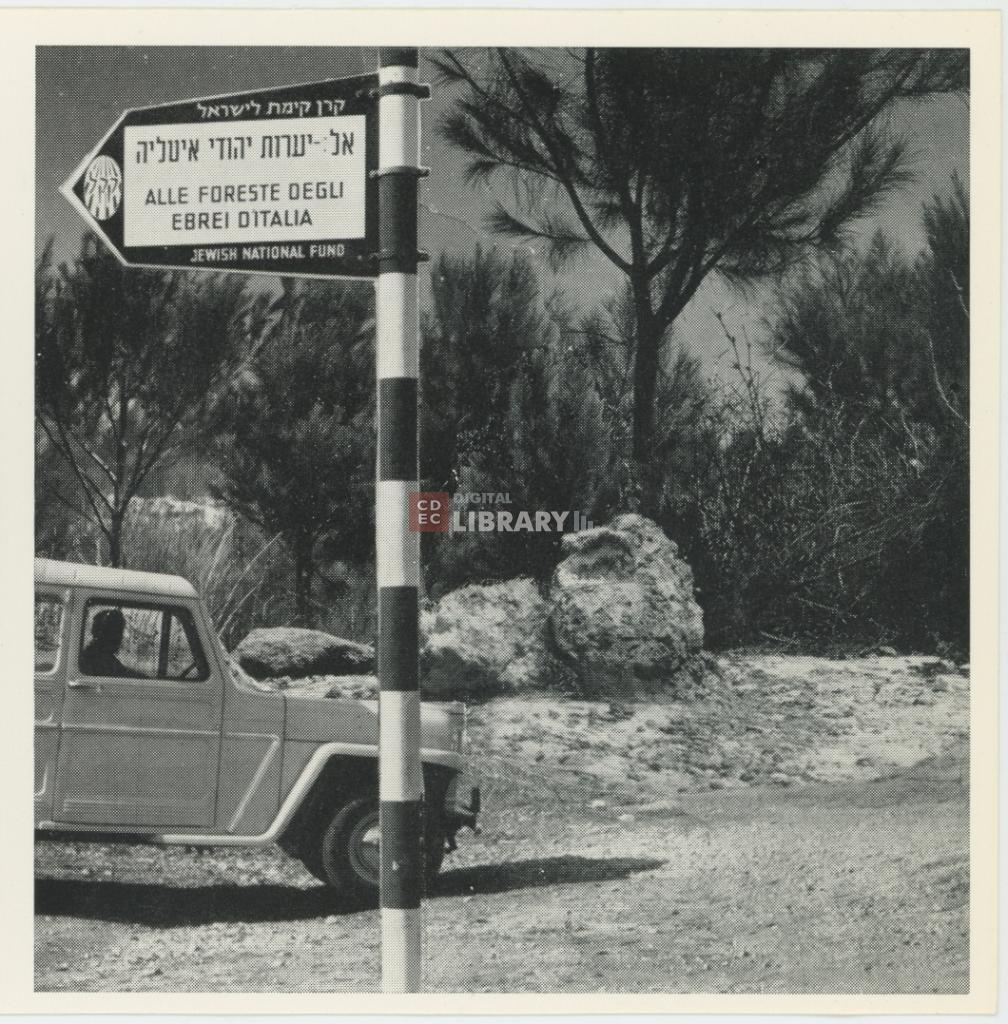 iscrizioni | nell'immagine un cartello stradale con la scritta in italiano e in ebraico "Alle foreste degli ebrei d'Italia/ Jewish National Fund" - sul verso del supporto due iscrizioni manoscritte a penna: a sinistra "Al bivio per Jodfat e la foresta degli Ebrei d'Italia/ Jodfat 1963", a destra "Il dispietramento e livellamento del terreno/ Jodfat 1963" |