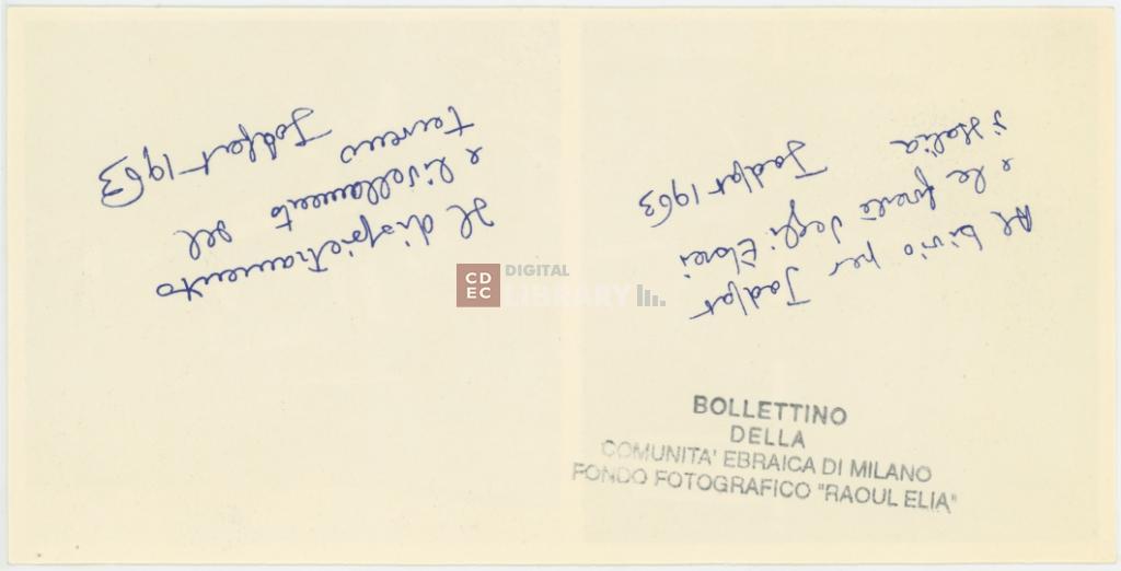 timbri, marchi | sul verso del supporto il timbro a inchiostro "Bollettino della Comunità ebraica di Milano/ Fondo Fotografico "Raoul Elia" |