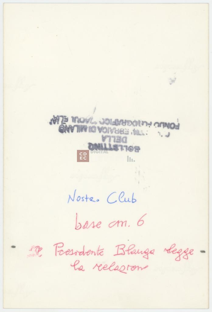 iscrizioni | sul verso del supporto l'iscrizione manoscritta "Nostro Club/ il Presidente Blanga legge la relazione" e indicazioni tipografiche |