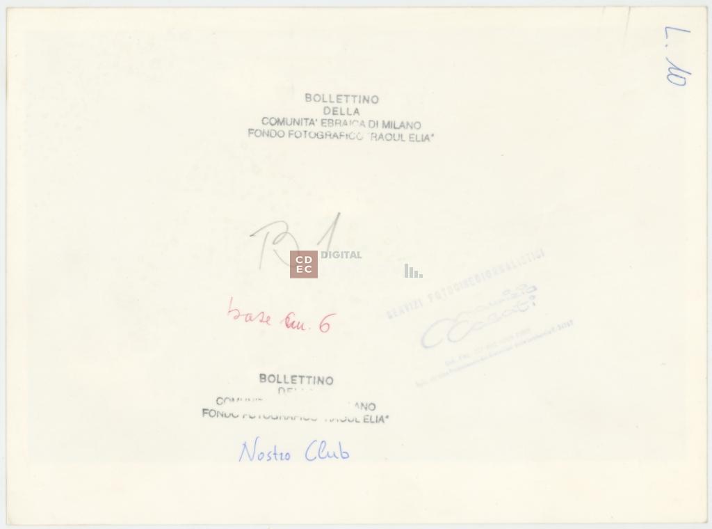 timbri, marchi | sul verso del supporto il timbro a inchiostro "Bollettino della Comunità ebraica di Milano/ Fondo Fotografico "Raoul Elia" e il timbro a inchiostro con il marchio commerciale del fotografo |