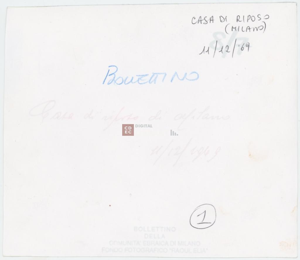 timbri, marchi | sul verso del supporto primario il timbro a inchiostro "Bollettino della Comunità ebraica di Milano/ Fondo Fotografico "Raoul Elia" |