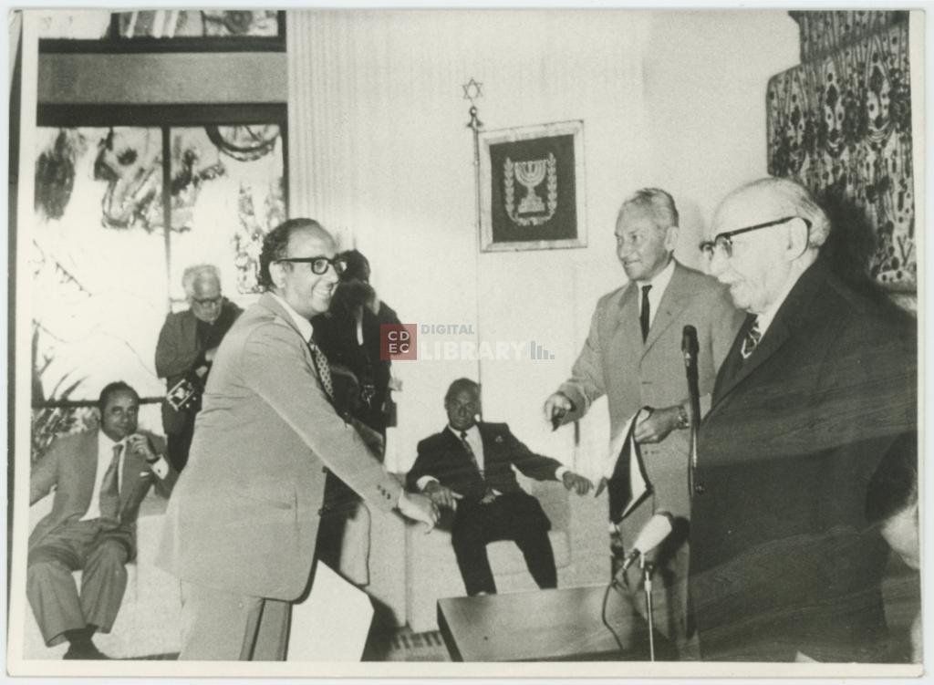 | titolo attribuito | Ritratto del Ministro del Commercio e dell'industria di Israele Haim Bar-Lev mentre consegna l'Israel export award a Heskel Nathaniel come riconoscimento a lui e alla sua azienda, Natex International Trade S.p.A, per l'esportazione di prodotti israeliani nel mondo |