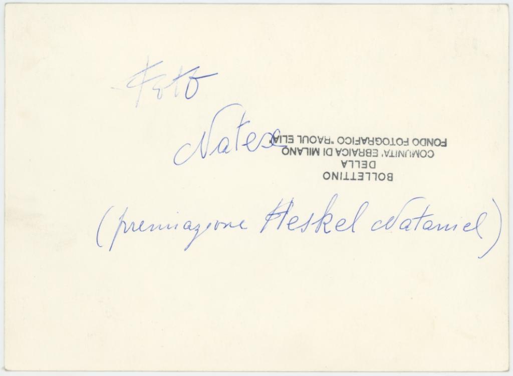 | iscrizioni | sul verso del supporto l'iscrizione manoscritta a penna "Foto Natese/ Premiazione Heskel Nataniel [sic]" |