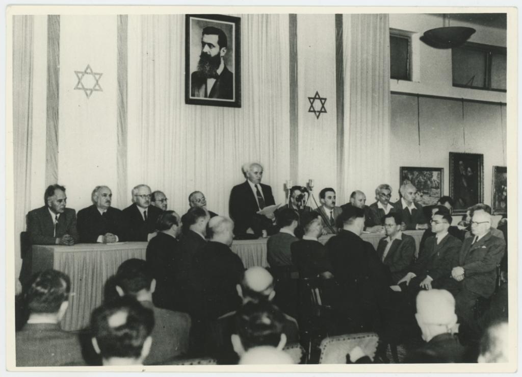 | osservazioni | Nella fotografia si riconosce al centro in piedi il Presidente dello Stato d'Israele David Ben Gurion il giorno della proclamazione dello Stato di Israele; sulla parete alle sue spalle il quadro con il ritratto di Theodor Herzl |