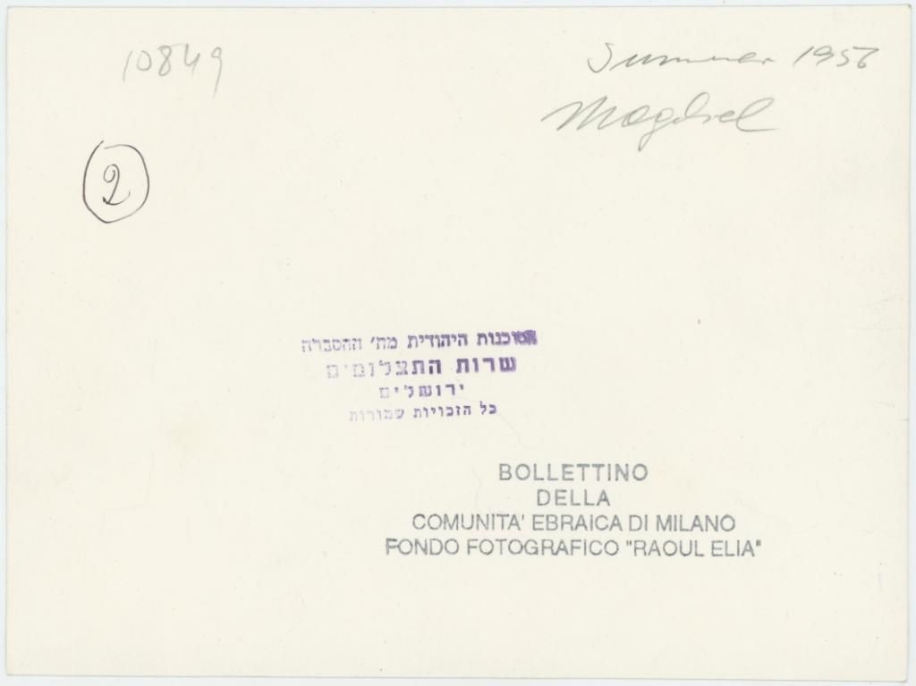| timbri, marchi | sul verso del supporto il timbro a inchiostro "Bollettino della Comunità ebraica di Milano/ Fondo Fotografico "Raoul Elia" e timbro a inchiostro con una scritta in lingua ebraica [trad. "Agenzia Ebraica dell'Informazione/ Servizio Fotografico Gerusalemme/ Tutti i diritti riservati"] |