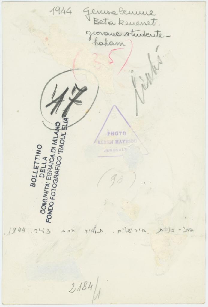 | timbri, marchi | sul verso del supporto il timbro a inchiostro "Bollettino della Comunità ebraica di Milano/ Fondo Fotografico "Raoul Elia" e il timbro a inchiostro "Photo Keren Hayesod Jerusalem" |