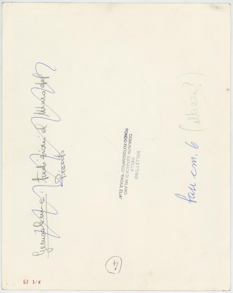 | timbri, marchi | sul verso del supporto il timbro a inchiostro "Bollettino della Comunità ebraica di Milano/ Fondo Fotografico "Raoul Elia" |