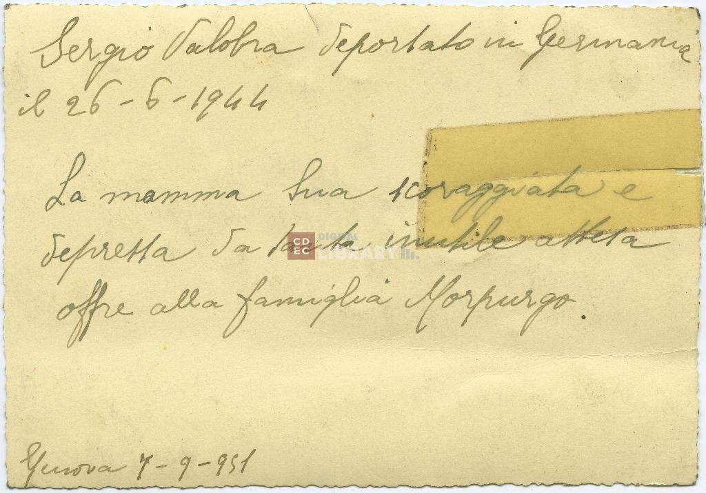 | iscrizioni | sul verso del supporto la dedica manoscritta "Sergio Valobra deportato in Germani il 26-6-1944/ La mamma Sua scoraggiata e depressa da tanta inutile attesa offre alla famiglia Morpurgo/ Genova 7-9-951" |
