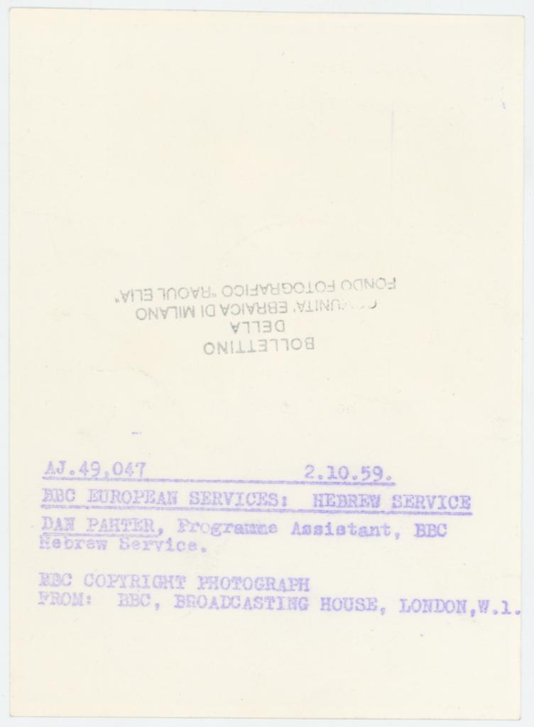 | iscrizioni | sul verso del supporto dattiloscritto "AJ.49.047 2.10.59./ BBC European Services: Hebrew Service/ Dan Pahter, Programme Assistant, BBC Hebrew Service./ BBC Copyright Photograph/ From: BBC, Broadcasting House, London, W.1." |