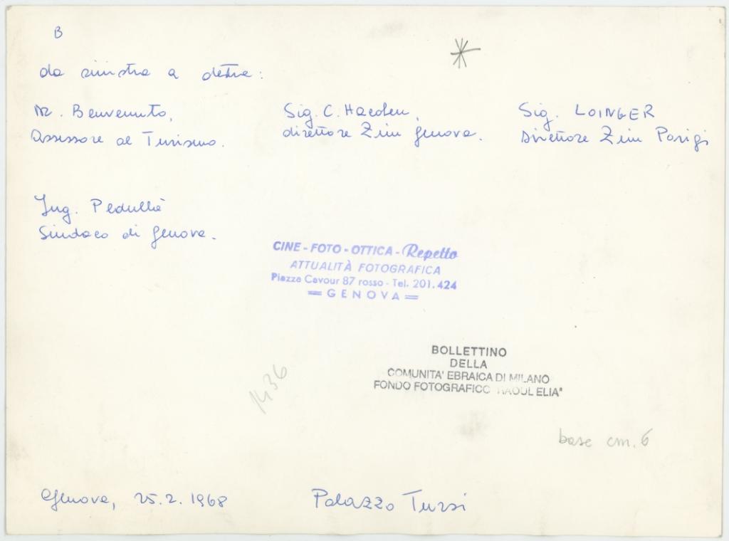 | iscrizioni | sul verso del supporto in alto le iscrizioni manoscritte a penna "da sinistra a destra:/ sr. Benvenuto, Assessore al Turismo./ Sig. C. Hacohen, direttore Zim genova./ Sig. Loinger direttore Zim Parigi/ Ing. Pedullà Sindaco di genova", in basso "Genova, 25.2.1968/ Palazzo Tursi" e indicazioni editoriali |