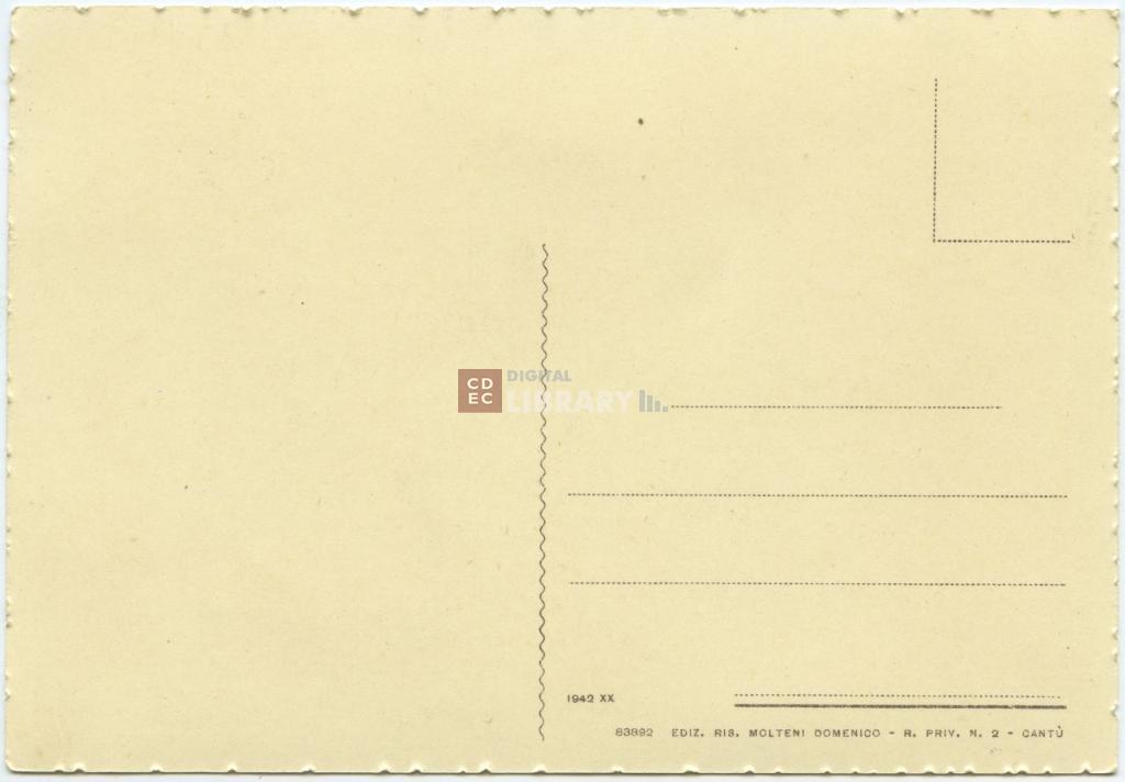 iscrizioni | sul verso del supporto, in basso a destra, l'iscrizione tipografica "1942 XX/ 83892 Ediz. Ris. Molteni Domenico - R. Priv. n. 2 - Cantù" |