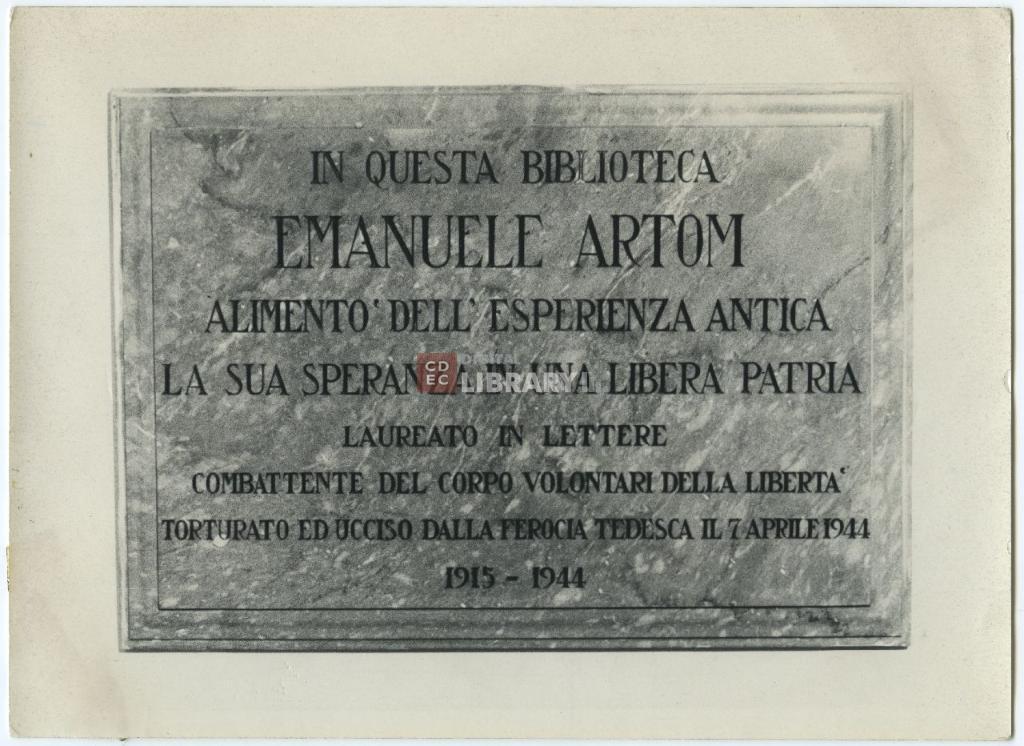 | osservazioni | La lapide riporta la seguente iscrizione: "In questa biblioteca Emanuele Artom alimentò dell'esperienza antica la sua speranza in una libera patria/ Laureato in Lettere/ combattente del Corpo volontari della libertà/ torturato ed ucciso dalla ferocia tedesca il 7 aprile 1944/ 1915 - 1944" |