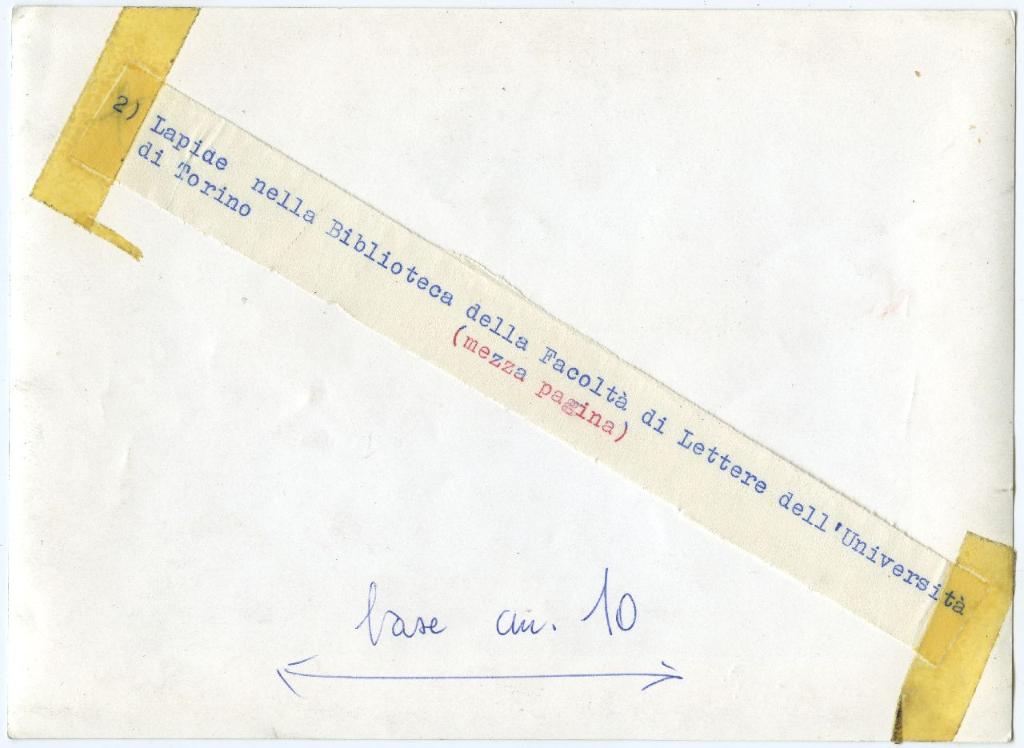 | iscrizioni | sul verso del supporto è incollato un foglio con la didascalia dattiloscritta "2) Lapide nella Biblioteca della Facoltà di Lettere dell'Università di Torino/ (mezza pagina)" |