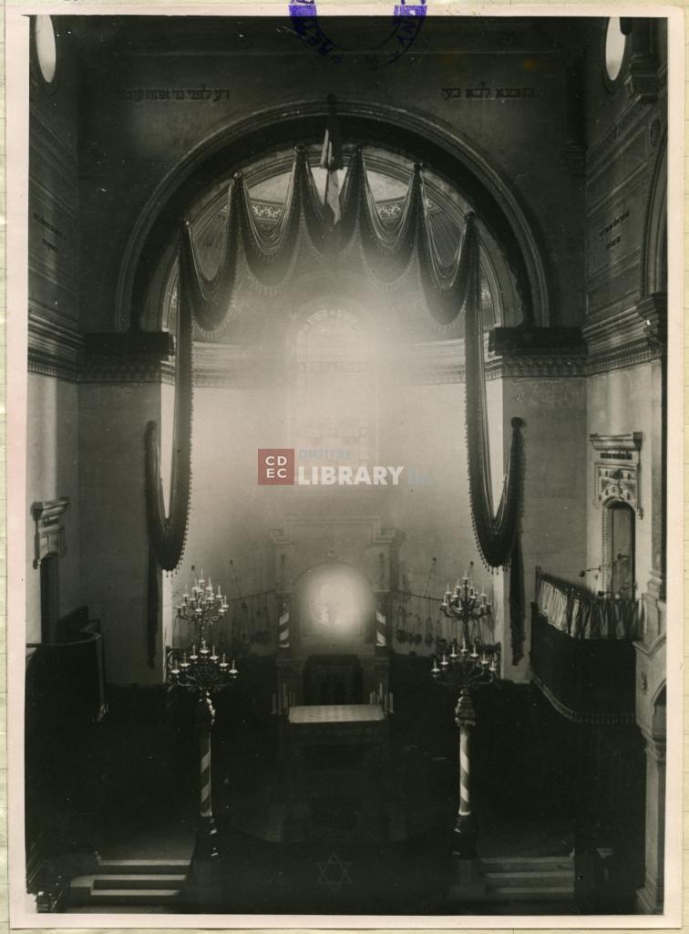 | notizie storico-critiche | Lo scatto riprende l'interno della sinagoga di via Guastalla prima del bombardamento aereo avvenuto nell'agosto 1943 e che distrusse l'intero edificio ad eccezione della facciata. Il tempio era stato progettato dall'architetto Luca Beltrami. |