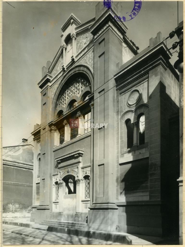 | notizie storico-critiche | Lo scatto riprende la facciata della sinagoga di via Guastalla dopo il bombardamento aereo avvenuto nell'agosto 1943 e che distrusse l'intero edificio ad eccezione della facciata. Si possono però i danni che anch'essa subì, ad esempio la distruzione delle vetrate istoriate, di cui rimane solo l'intelaiatura, e del portone di accesso sostituito provvisoriamente da una colata di cemento. Il tempio era stato progettato dall'architetto Luca Beltrami. |