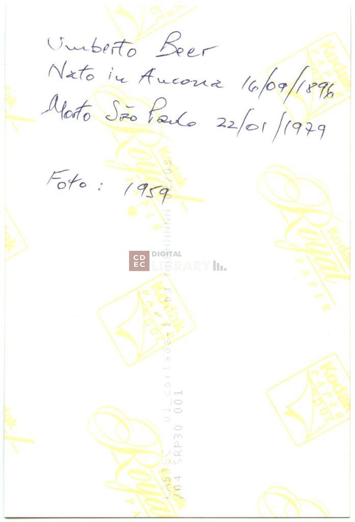 | iscrizioni | sul verso del supporto l'indicazione manoscritta "Umberto Beer/ Nato in Ancona 16/09/1896/ Morto Sao Paolo 22/01/1979" e "Foto: 1959" |