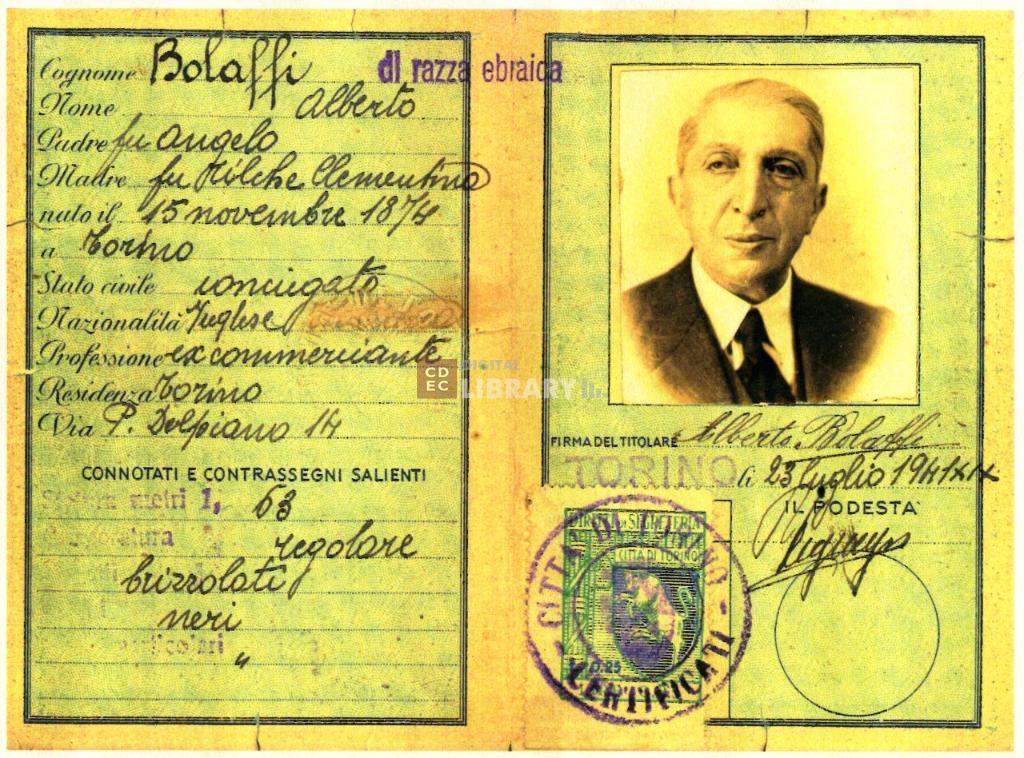 notizie storico-critiche | La carta d'identità di Alberto Bolaffi, rilasciata dal Comune di Torino il 23 luglio 1941, riporta la dicitura "di razza ebraica" |