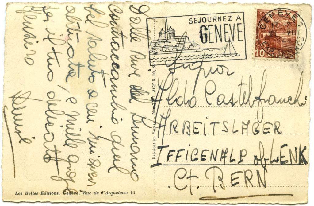 | notizie storico-critiche | La cartolina postale inviata da Annie era indirizzata al signor Aldo Castelfranchi presso l'Arbeitslager Iffigenalp ob Lenk |