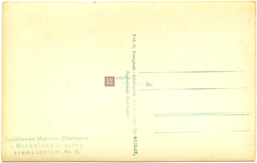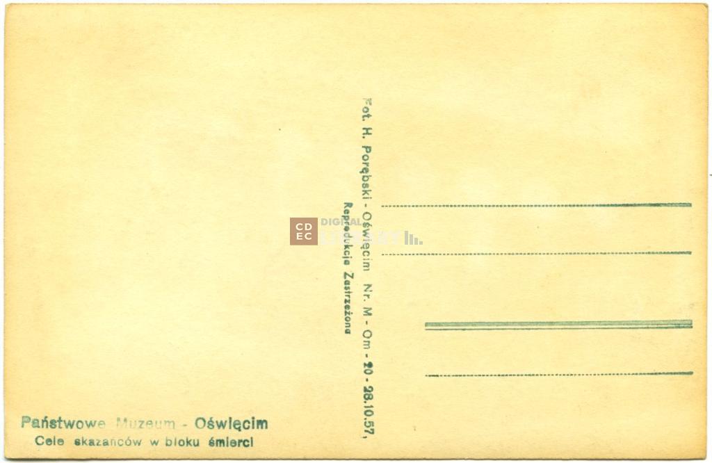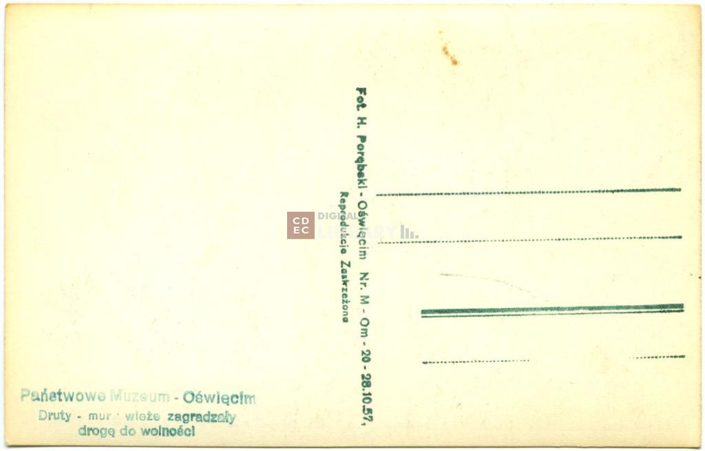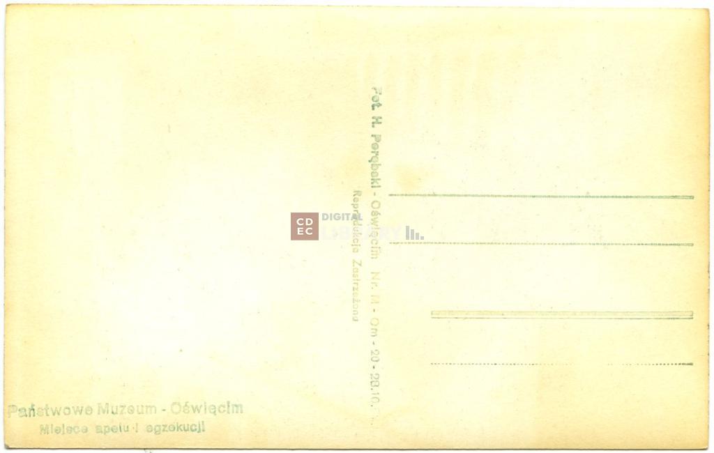 | notizie storico-critiche | La serie fotografica mostra vedute esterne e interne del campo di sterminio di Auschwitz-Birkenau, eseguite da Henryk Porębski (ex-prigioniero del campo). Ogni fotografia è accompagnata da una didascalia in lingua polacca, riportata sul verso del supporto. Le cartoline sono state prodotte dal Museo statale di Auschwitz,. |