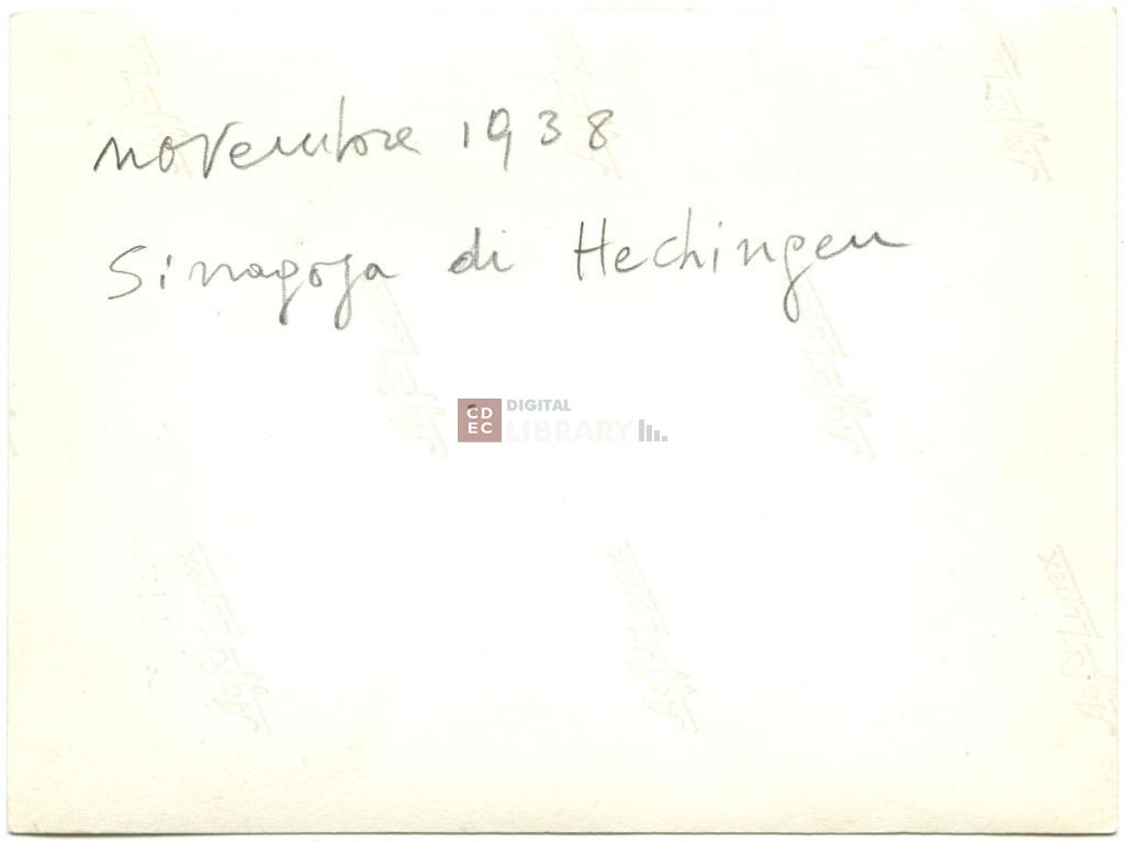 | iscrizioni | sul verso del supporto la didascalia manoscritta "novembre 1938 sinagoga di Hechingen" |