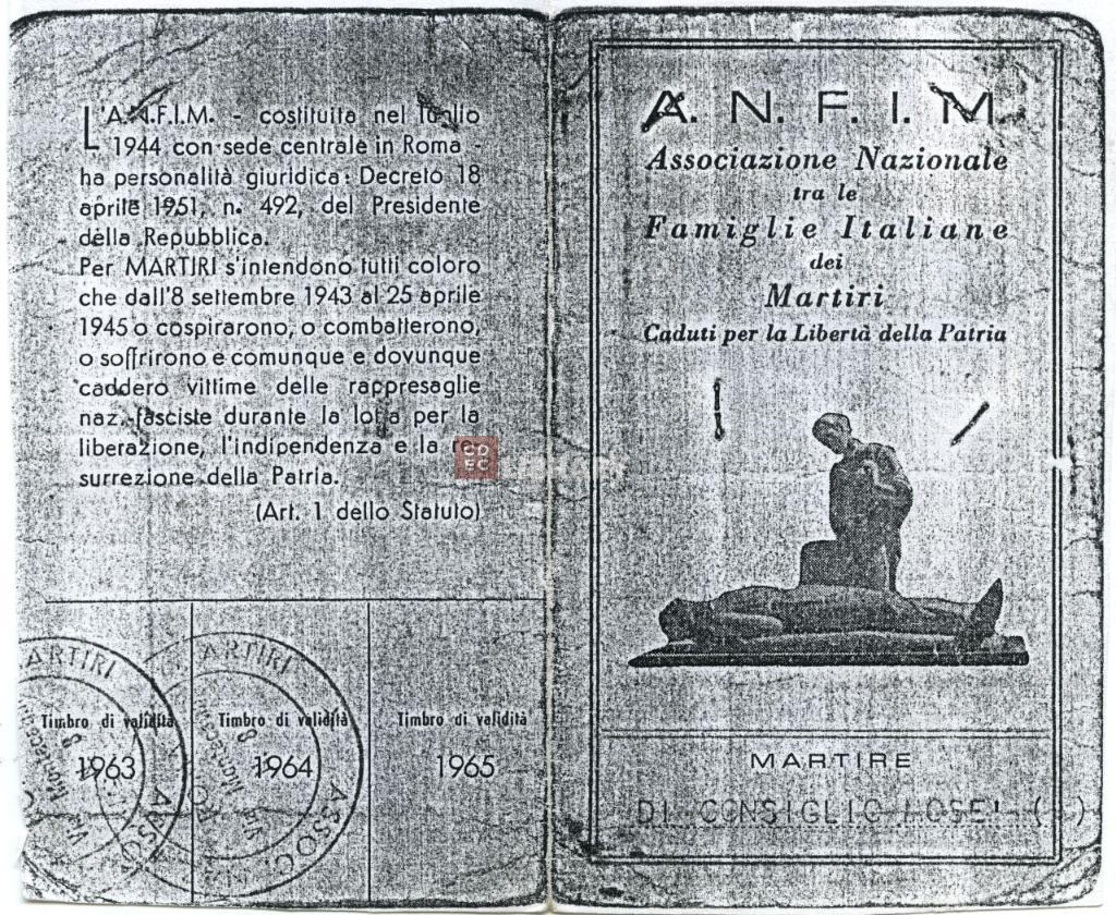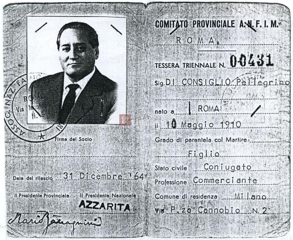 notizie storico-critiche | La tessera triennale n. 00431 emessa dal Comitato provinciale di Roma dell'Associazione Nazionale tra le Famiglie italiane dei Martiri Caduti per la Libertà della Patria - A.N.F.I.M. è intestata a Pellegrino Di Consiglio, figlio del martire Mosè Di Consiglio |