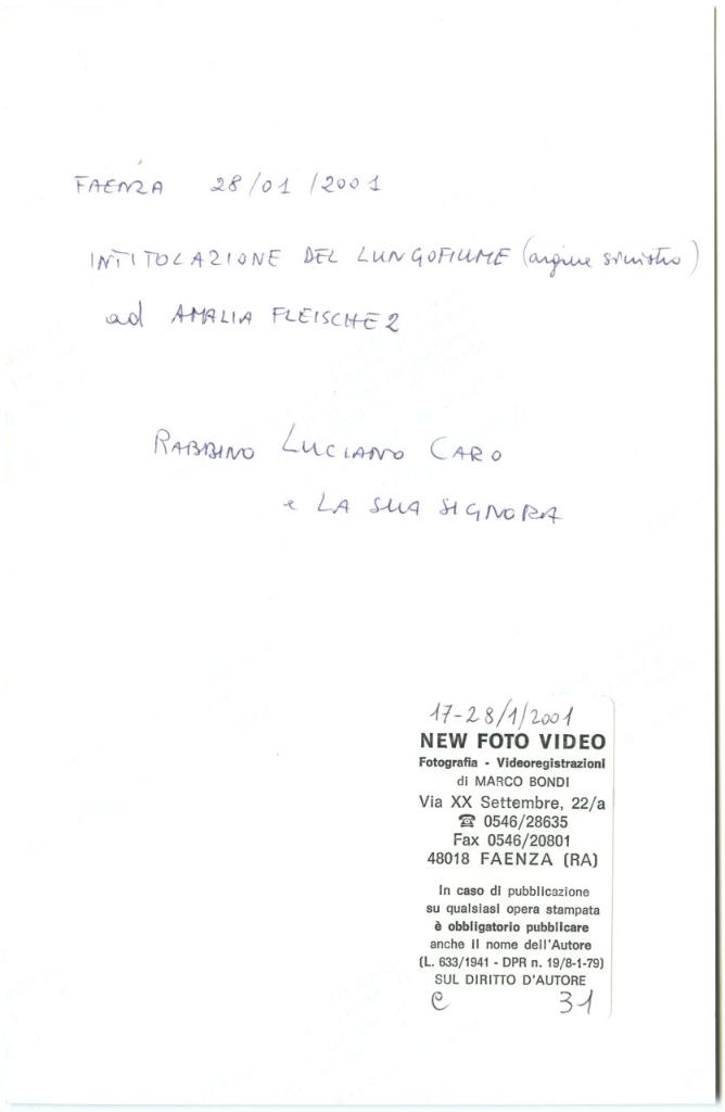 | iscrizioni | nell'immagine sulla targa la scritta "Lungofiume Amalia Fleischer/ Vienna 1885 - Auschwitz 1944/ Ebrea/ Deportata da Faenza - Convoglio RSHA 06" - sul verso del supporto l'iscrizione manoscritta "Faenza 28/01/2001 Intitolazione del lungofiume ad Amalia Fleischer/ nella foto il Rabbino Luciano Caro e la sua signora" |