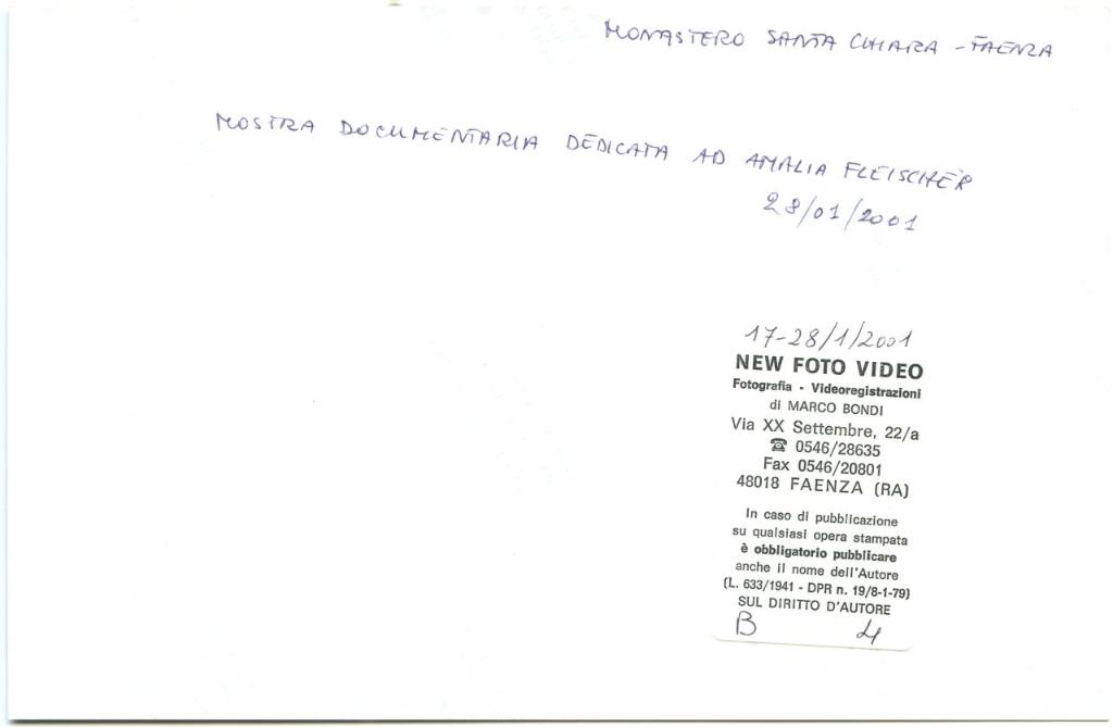 | iscrizioni | sul verso del supporto l'iscrizione manoscritta "Monastero S. Chiara - Faenza/ Mostra documentaria dedicata ad Amalia Fleischer/ 28/01/2001" |