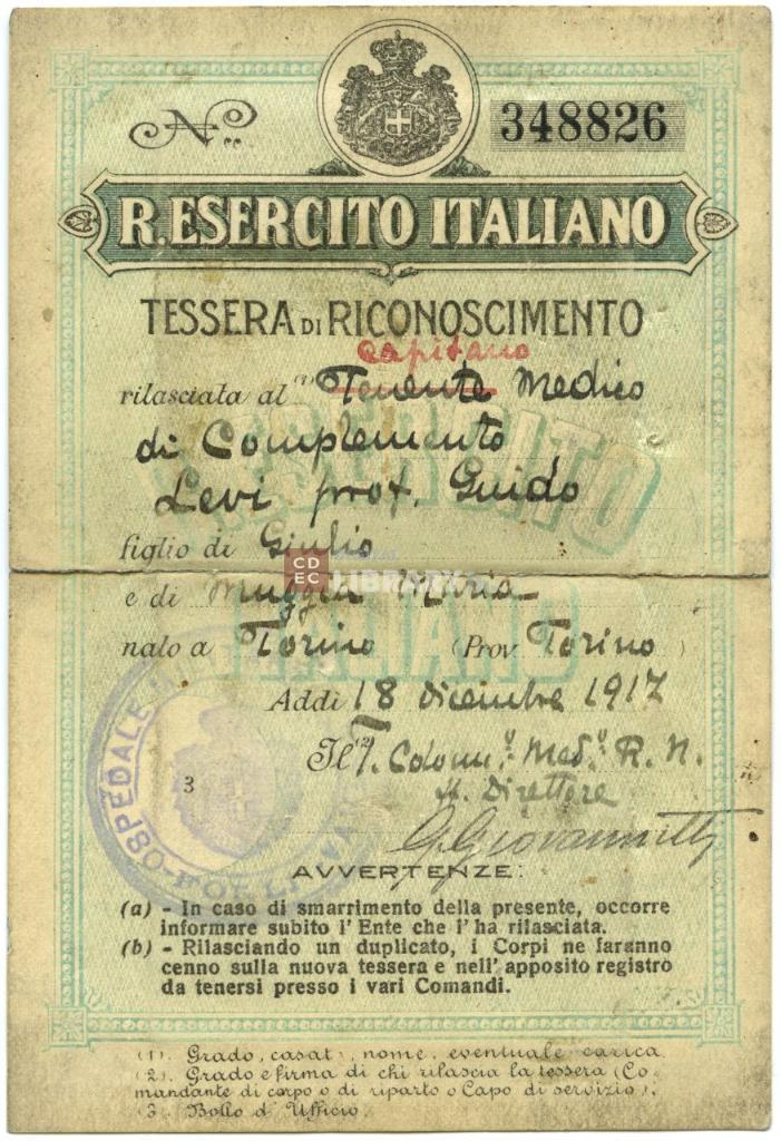 titolo attribuito | Tessera di riconoscimento del R. Esercito italiano del Capitano Levi Guido |