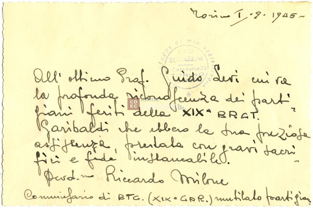 iscrizioni | sul verso del supporto la dedica "Torino 1-9-1945/ All'ottimo Prof. Guido Levi cui va la profonda riconoscenza dei partigiani feriti della XIX BRGT. Garibaldi che ebbero la tua preziosa assistenza, prestata con gravi sacrifici e fede instancabili. Devot.mo Riccardo Milone/ Commissario di BTG. (XIX GAR.) mutilato partigiano" |