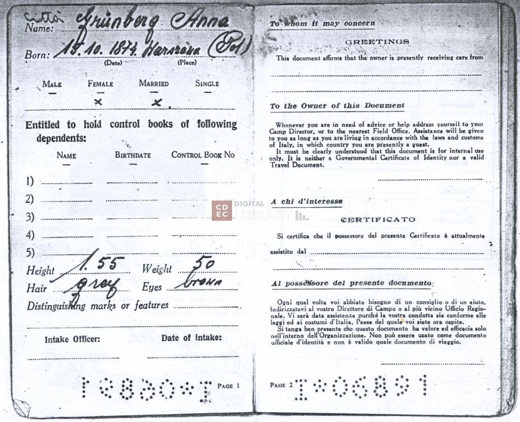 notizie storico-critiche | sul documento รจ presente l'indicazione del luogo di soggiorno di Anna Pinkert vedova Grinberg ossia "Adriatico Camp Milano" |