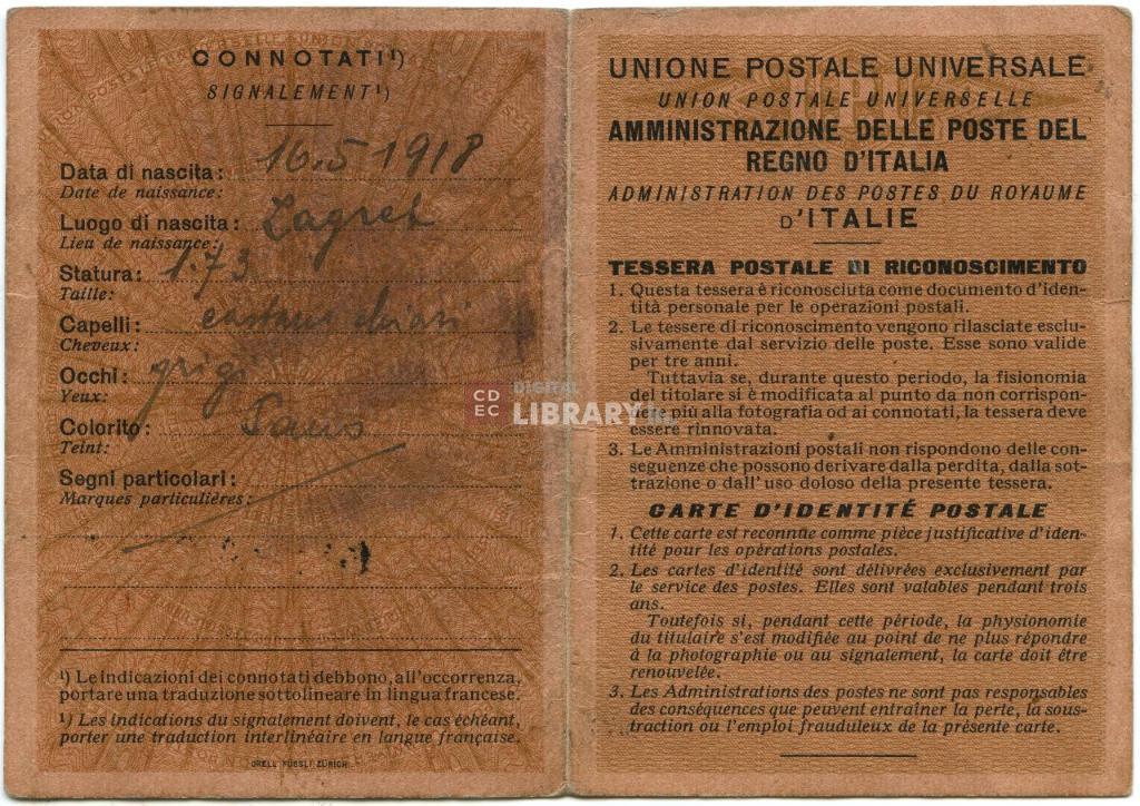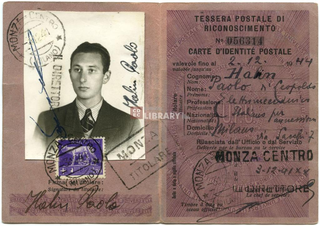 titolo attribuito | Tessera postale di riconoscimento con false generalità di Paolo Hahn (alias Paolo Halin) |