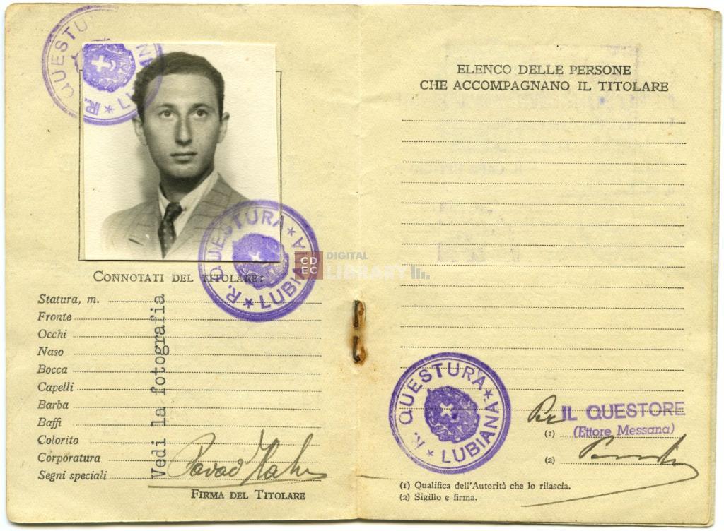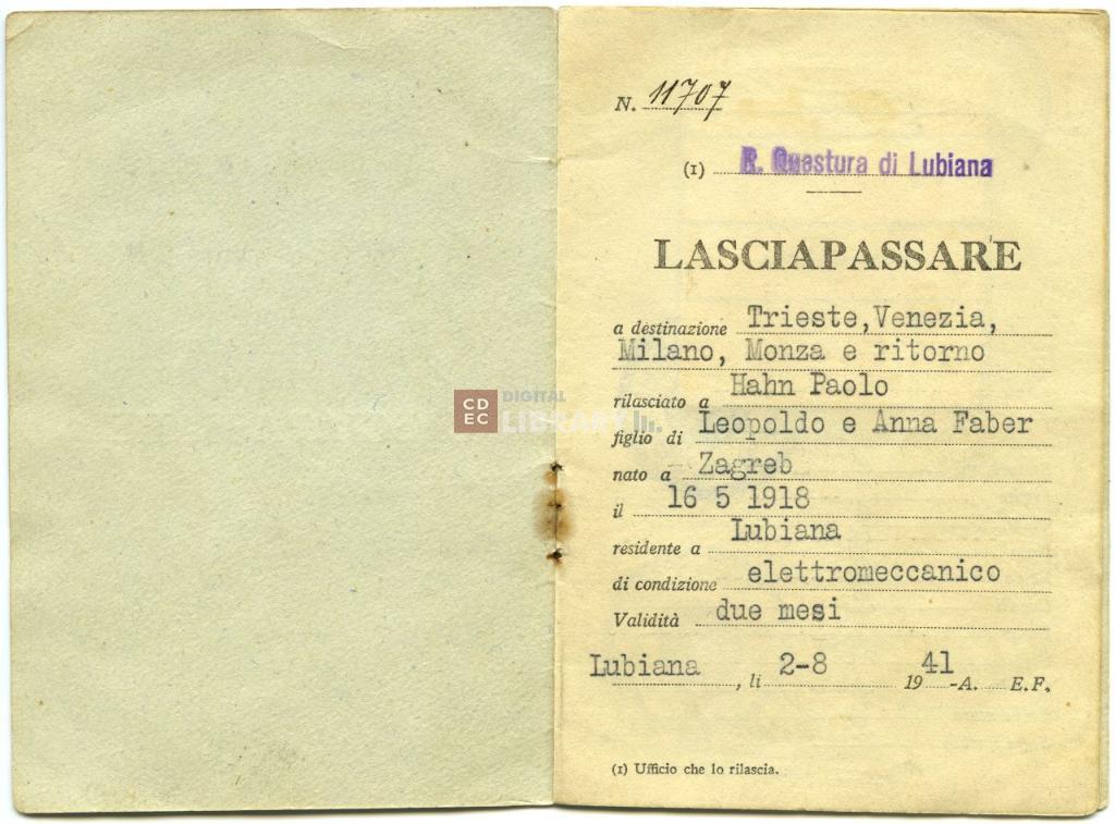 notizie storico-critiche | Il documento di riconoscimento fu rilasciato il 2 agosto 1941 dalla Questura di Lubiana quale lasciapassare per Paolo Hahn "a destinazione Trieste, Venezia, Milano, Monza e ritorno" |